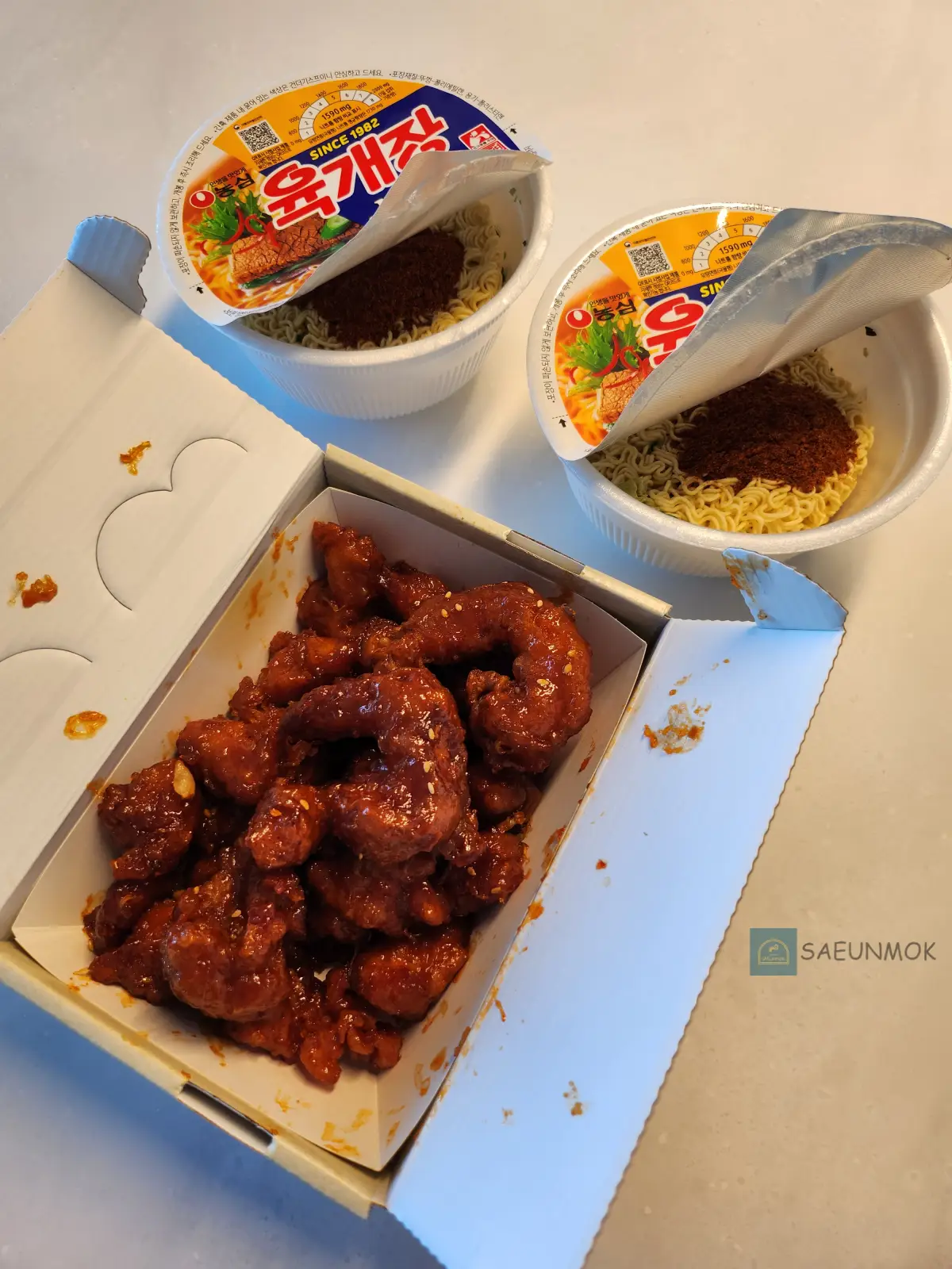 컵라면과 같이 먹을 예정이라 큰걸 사진 않았고, 닭강정과 새우강정 반반 세트 작은 것으로 샀어요.