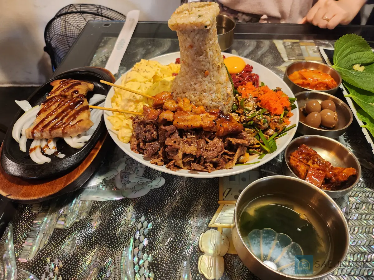 그 외에도 육회, 꼬막무침, 연탄불고기, 계란스크램블, 닭꼬치까지 총 7가지 메뉴를 한 번에 즐길 수 있어서 이거 하나면 웬만한 건 다 먹을 수 있습니다.
