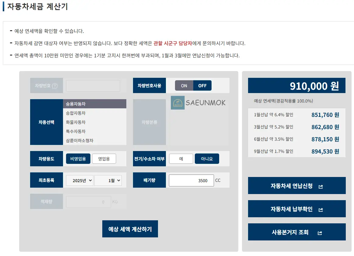 자동차세는 2025년 1월 등록, 3,500cc, 1월 선납 기준 1년에 85만 원입니다.
