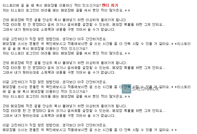 근데 메모장에 적은 글을 단순히 복사 붙여 넣기 하면 이상하게 들어가게 됩니다.