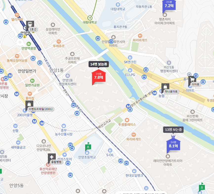 단지가 워낙 크기 때문에 동별로 선호도가 많이 다를 수 있는데 실제 가본 결과 안양천을 따라 안양천 뷰가 보이는 곳이 가장 선호도가 높아 보였고, 1호선 라인이 보이는 쪽은 상대적으로 가격이 좀 떨어졌다.