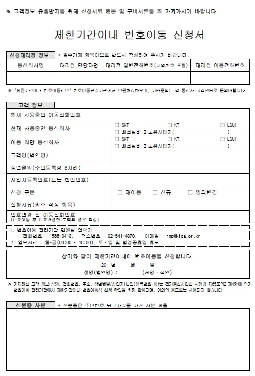 그래서 찾아보니 번호이동 제한 해제를 하기 위해서는 한국통신사업자연합회에서 번호이동 제한 해제 서류를 따로 작성해야 되더라고요.