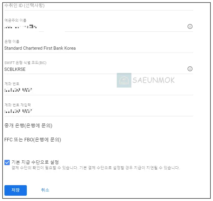 저는 이전 글에서 말씀드린 것처럼 SC제일은행 계좌로 했기 때문에 이 계좌로 기입을 했습니다.