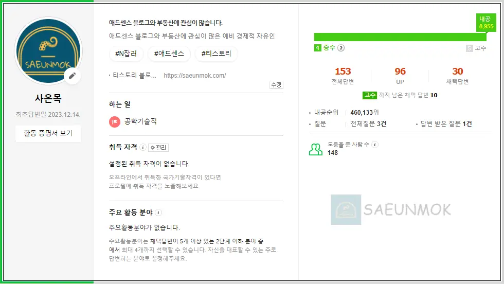 어쨌든 이번 네이버 지식인 제도 변화에 따라 지식인 활동을 더 열심히 해야겠다는 생각이 들었습니다.