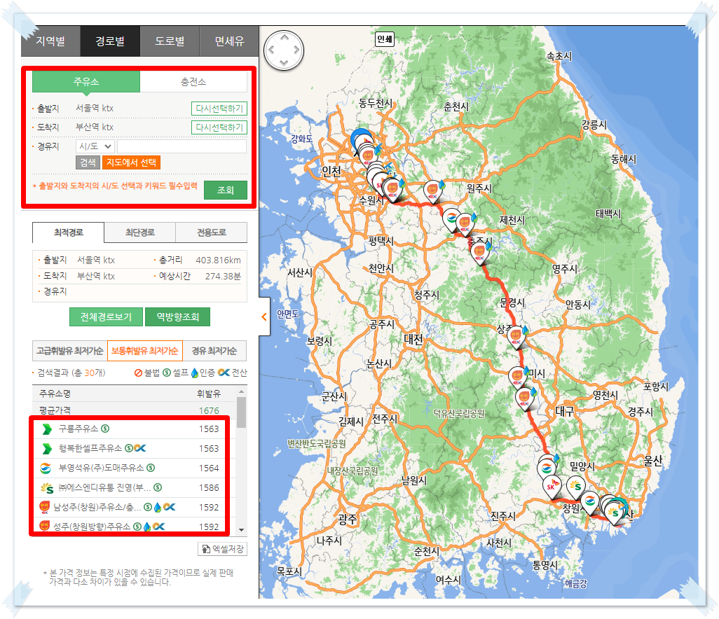 편리한 점은 지역별로 찾을 수도 있고, 여행을 갈 때는 내가 가는 경로별, 도로별로도 저렴한 주유소를 찾을 수 있다.