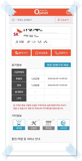 PC와 동일하게 내주변, 지역별, 경로별 주유소를 찾을 수 있고, 각 주유소를 클릭하면 휘발유와 경유, 고급휘발유, LPG의 가격을 실시간으로 확인할 수 있다.